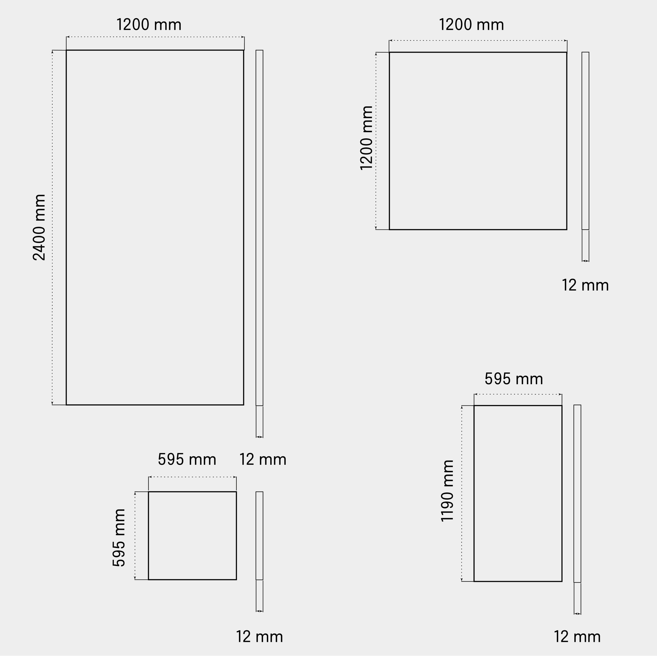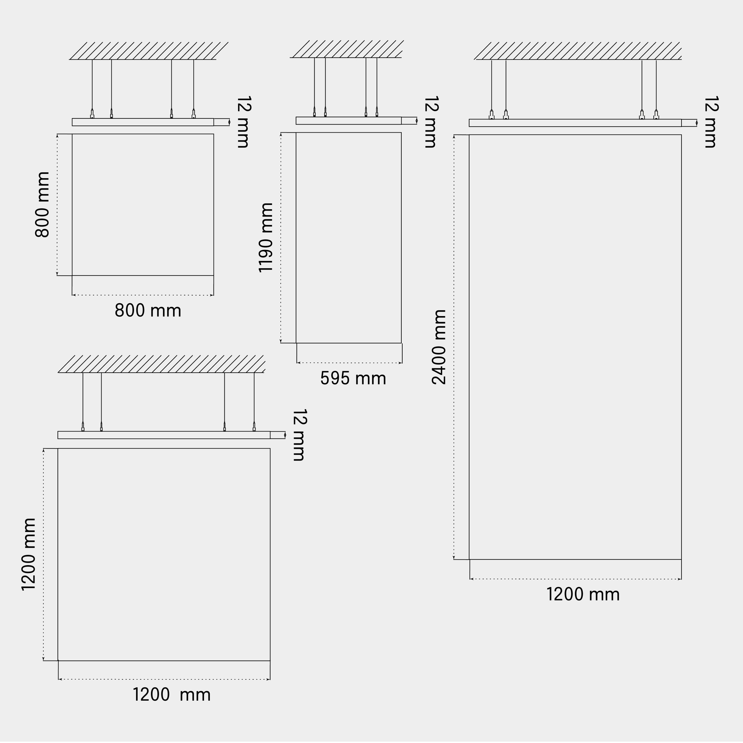 Pegado a pared o techo: 595 x 595 mm Suspendido a techo: |