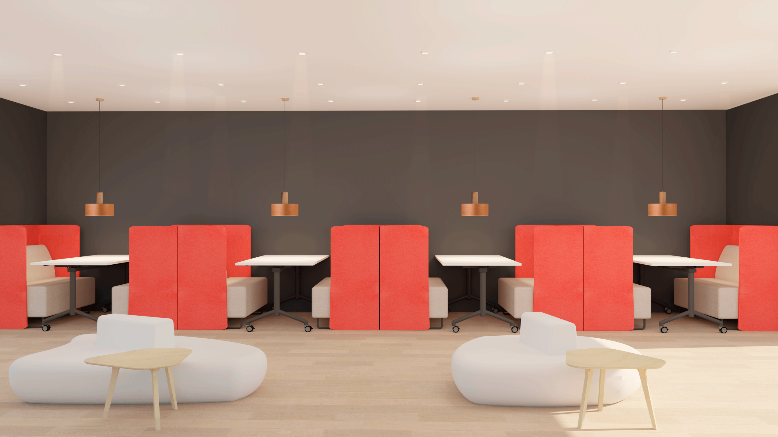 Mesas de trabajo compartidas y elementos acústicos cuidadosamente integrados crean un espacio estimulante donde las mentes brillantes se encuentran y las ideas toman vuelo. Cada caseta está acondicionada acústicamente con Regular [Eco]Panel en tres colores Red, White y Grey.
